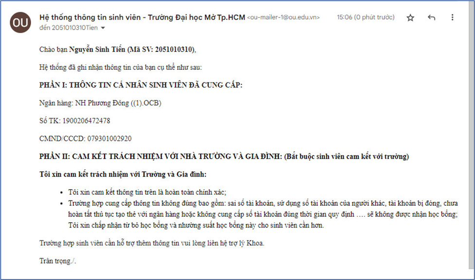 - Các sinh viên khi cung cấp tài khoản sẽ được hệ thống mặc định gửi email xác nhận thông tin như sau: